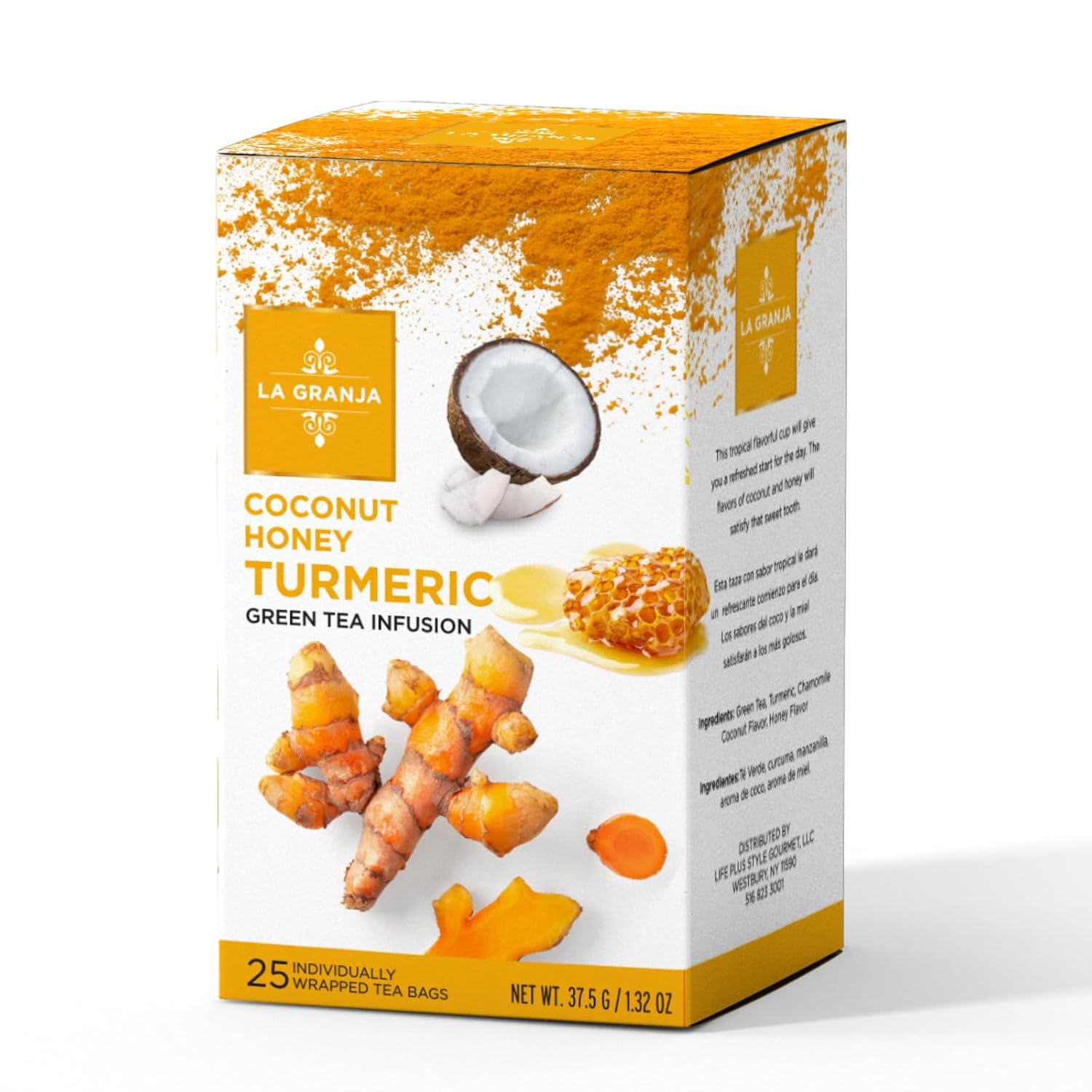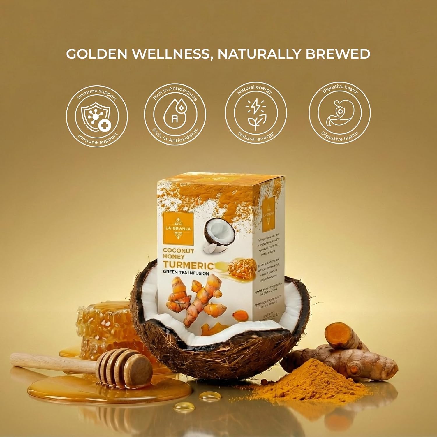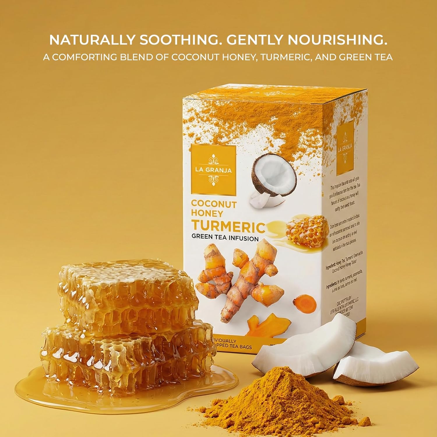 • A unique fusion of green tea, turmeric, chamomile, coconut, and honey for a rich, layered flavor.