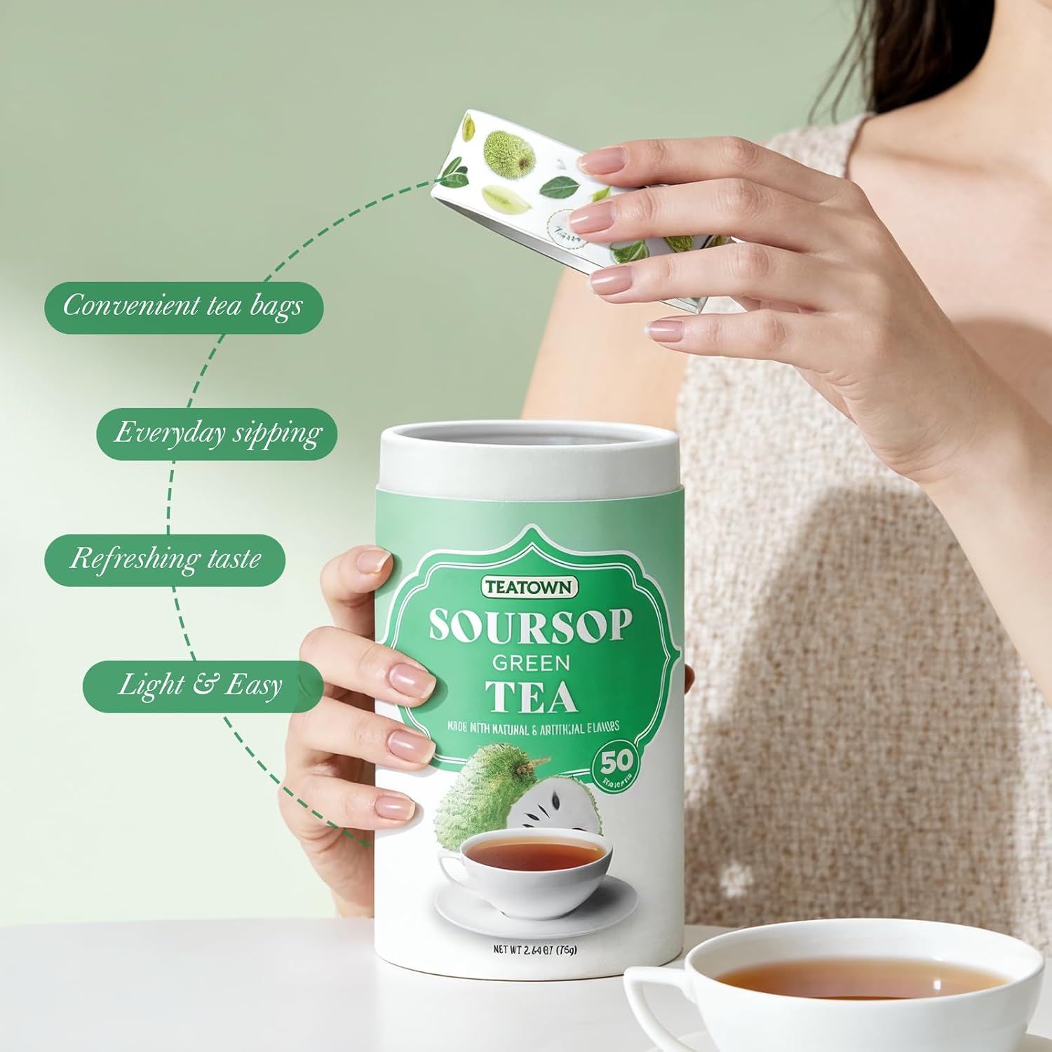 - NATURAL SOURSOP GREEN TEA - Life Plus Style Gourmet Tea Town Soursop Green Tea features natural soursop flavor highlight a clean soursop tea profile with no sugar and no additives for a straightforward daily tea choice